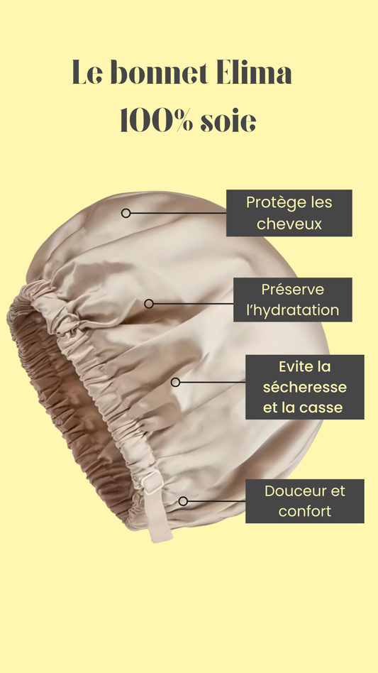 Avec notre nouveauté exclusive, Le bonne 100% soie ELIMA vos cheveux seront protégés toute la nuit, pour des chveeux toujours aussi doux et hydratés le lendemain !